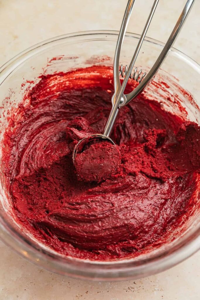Step 2: Add the red velvet cake mix (and espresso powder, if using) and stir until a cohesive dough forms with no dry streaks remaining.